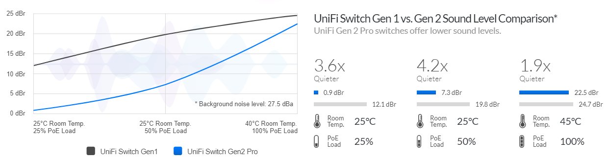 Това е автоматичен превод. Оригиналния текст може да видите тукВторото поколение UniFi превключватели носят много промени и подобрения, превключвателите са преработени от самото начало. В сравнение с първото поколение, има значително подобрение във въздушния поток , който се използва за охлаждане, което го прави до 4 пъти по-тих* от първото поколение.