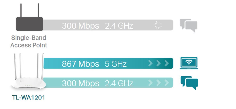 Надстройте вашата домашна или офис мрежа с усъвършенстваната 802.11ac Wave 2 AP, която предлага двулентови скорости до 1200 Mbps – три пъти повече от производителността на Wireless N. Технологията MU-MIMO позволява на AP да обслужва множество устройства едновременно без претоварване или латентност. Всички устройства получават своите данни по-бързо и Wi-Fi се използва по-ефективно.