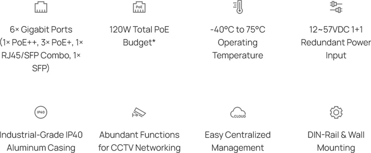 Индустриалният лесно управляем комутатор има 4 гигабитови LAN порта, 1 комбиниран RJ45/SFP слот и 1x SFP. Устройството е с монтаж на DIN шина. Работният температурен диапазон е между -40 и 75 °C. Устройството е с алуминиев корпус със степен на защита IP40.