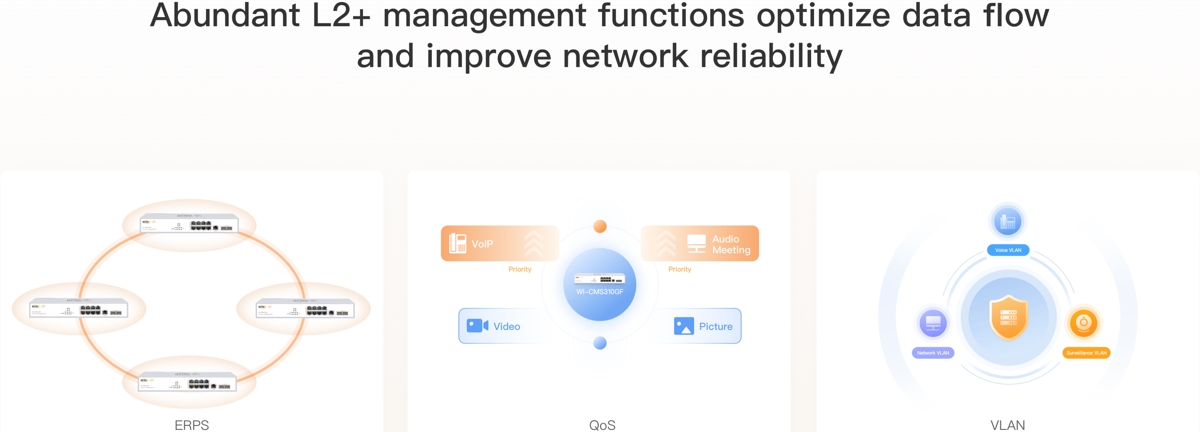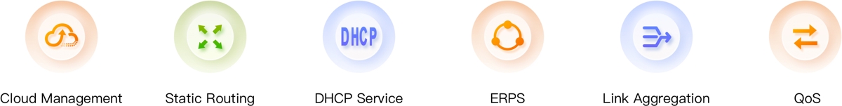 - Автоматично предотвратяване на цикли, VLAN, IGMP snooping, QoS и агрегиране на връзки