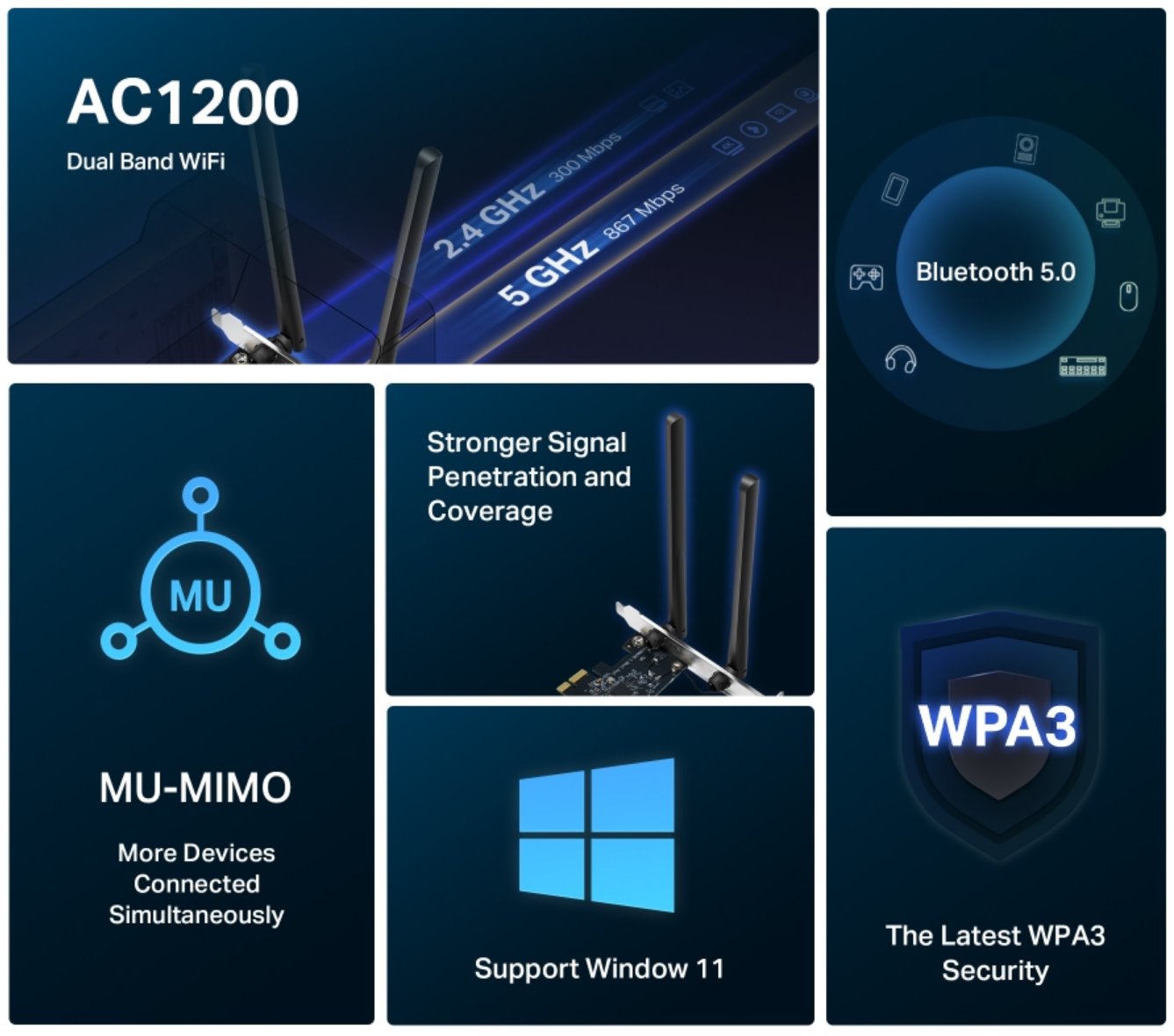 Mercusys MA30E е вътрешен PCIe двубандов WiFi и Bluetooth 5.0 адаптер, оборудван с WiFi 5 технология със скорости до 867 Mb/s в честотната лента 5 GHz и 300 Mb/s в честотната лента 2,4 GHz с поддръжка на MU-MIMO . Подобрена защита в личната безопасност с технологиите WPA-PSK/WPA2-PSK/WPA3-SAE. Адаптерът е напълно съвместим с операционна система Windows 10, 11 (64-bit).