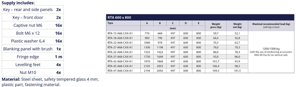 Това е автоматичен превод. Оригиналния текст може да видите тукTriton RTA-37-A68-CAX-A1 is a one-piece welded free-standing cabinet with removable side panels and lockable doors, with a size of 37U and a depth of 800mm. The custom hinge system allows the 4mm tempered glass door to open at an angle of 165°. The door can be easily removed and reinstalled to open in the opposite direction. For this type of cabinet, special metal doors with preparation for mounting RAx-CH-X0x-X3 ventilation units can be ordered. The vertical rails are continuously adjustable to any depth within the cabinet, making it easier to install equipment and organize patch cables.
